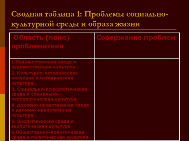 Слайд 31Сводная таблица 1: Проблемы социально-культурной среды и образа жизни