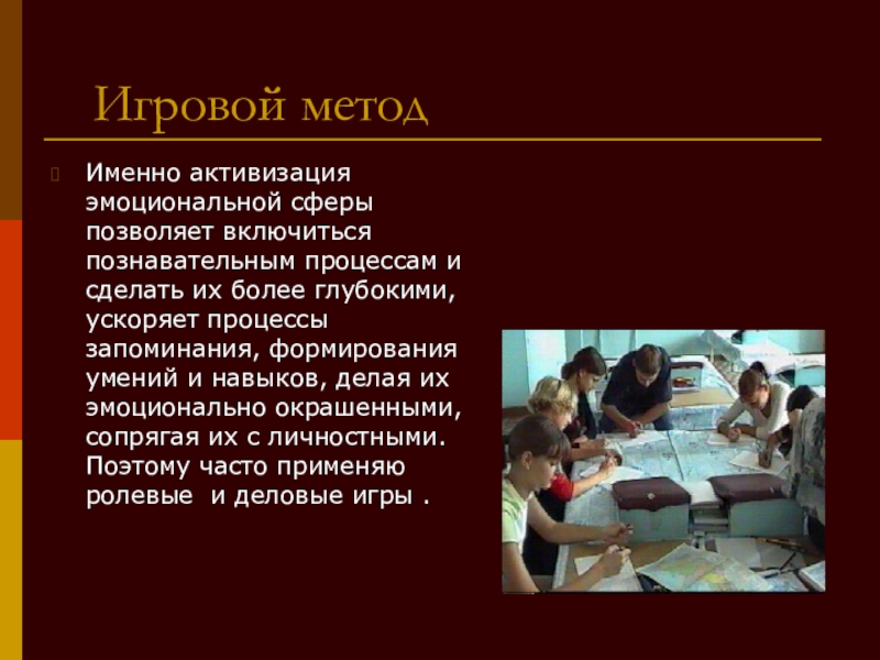 процессам и сделать их более глубокими, ускоряет процессы запоминания, формирования умений и навыков, делая их эмоционально окрашенными, сопрягая их с личностными. Поэтому часто применяю ролевые и деловые игры .