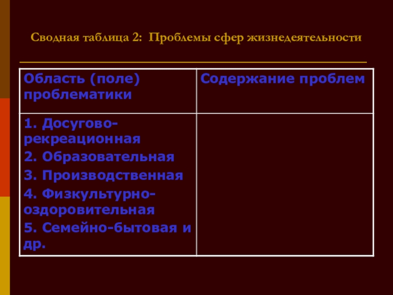 Сводная таблица 2: Проблемы сфер жизнедеятельности