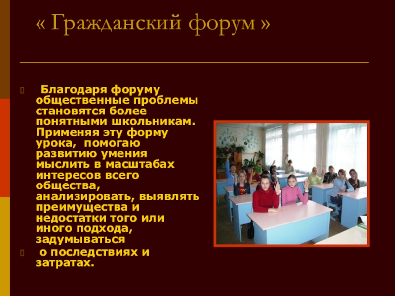 понятными школьникам. Применяя эту форму урока, помогаю развитию умения мыслить в масштабах интересов всего общества, анализировать, выявлять преимущества и недостатки того или иного подхода, задумываться