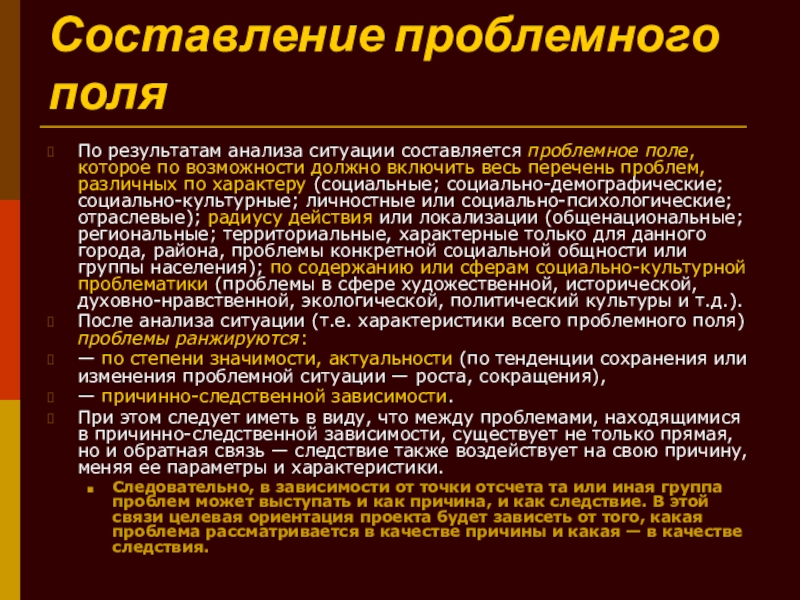 Проблемы формулируются на основе анализа социокультурной ситуации, которая понимается как совокупность условий и факторов, в которых функционирует личность, социальная группа, общность