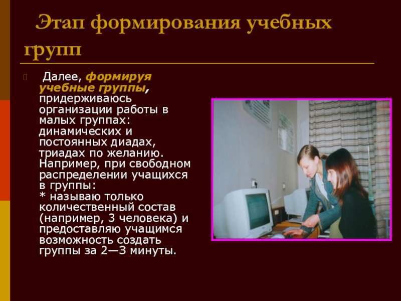 работы в малых группах: динамических и постоянных диадах, триадах по желанию. Например, при свободном распределении учащихся в группы: