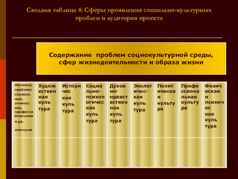 Сводная таблица 4: Сферы проявления социально-культурных проблем и аудитория проекта