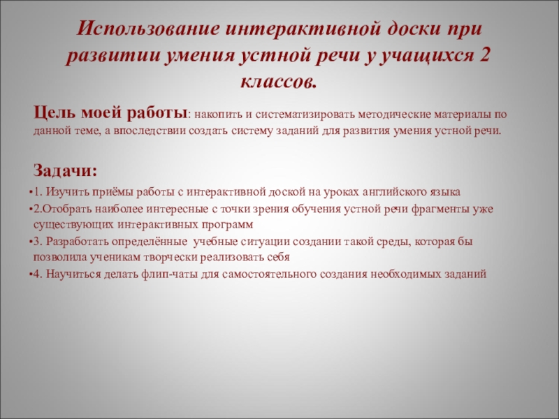 Цель моей работы: накопить и систематизировать методические материалы по данной теме, а впоследствии создать систему заданий для развития умения устной речи.