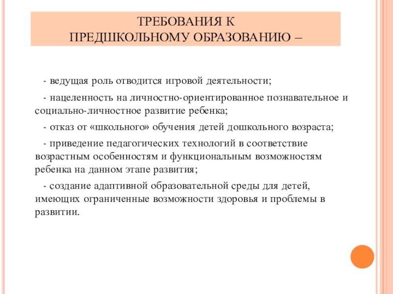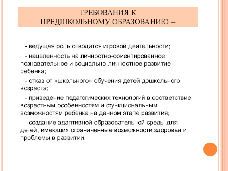 - отказ от «школьного» обучения детей дошкольного возраста;