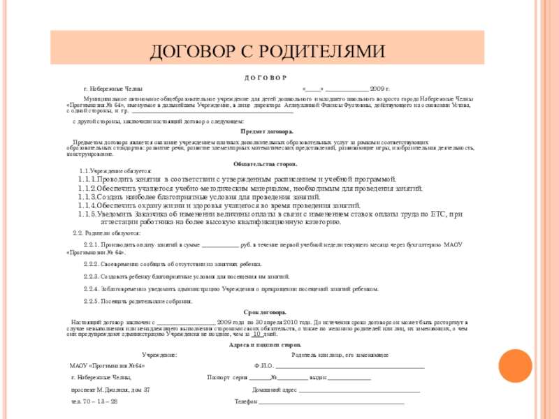 договор с родителями ребенка, посещающего школу «Малышка»