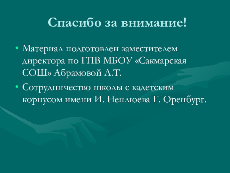 Слайд 38Материал подготовлен заместителем директора по ГПВ МБОУ «Сакмарская СОШ» Абрамовой Л.Т.