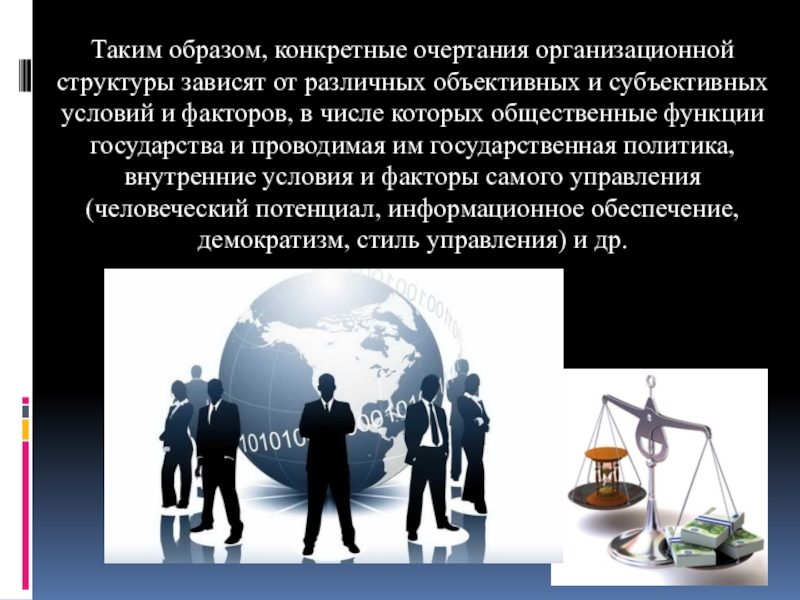 Слайд 10Таким образом, конкретные очертания организационной структуры зависят от различных объективных и