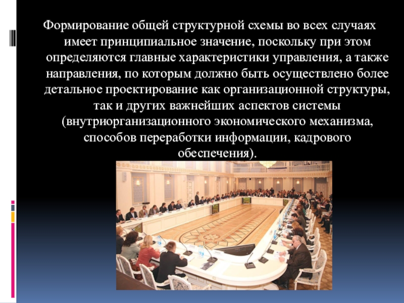 при этом определяются главные характеристики управления, а также направления, по которым должно быть осуществлено более детальное проектирование как организационной структуры, так и других важнейших аспектов системы (внутриорганизационного экономического механизма, способов переработки информации, кадрового обеспечения).