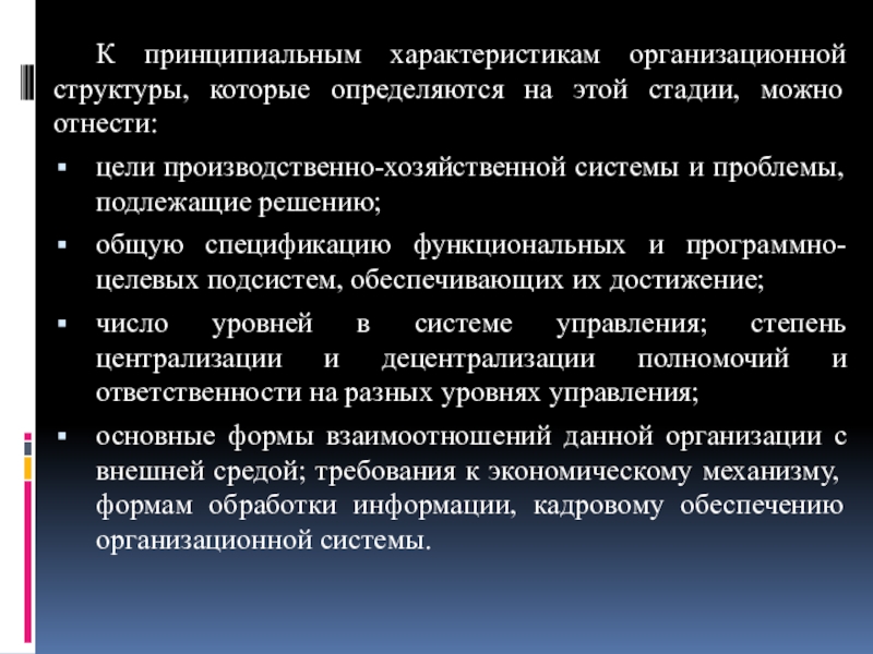 Слайд 21К принципиальным характеристикам организационной структуры, которые определяются на этой стадии, можно