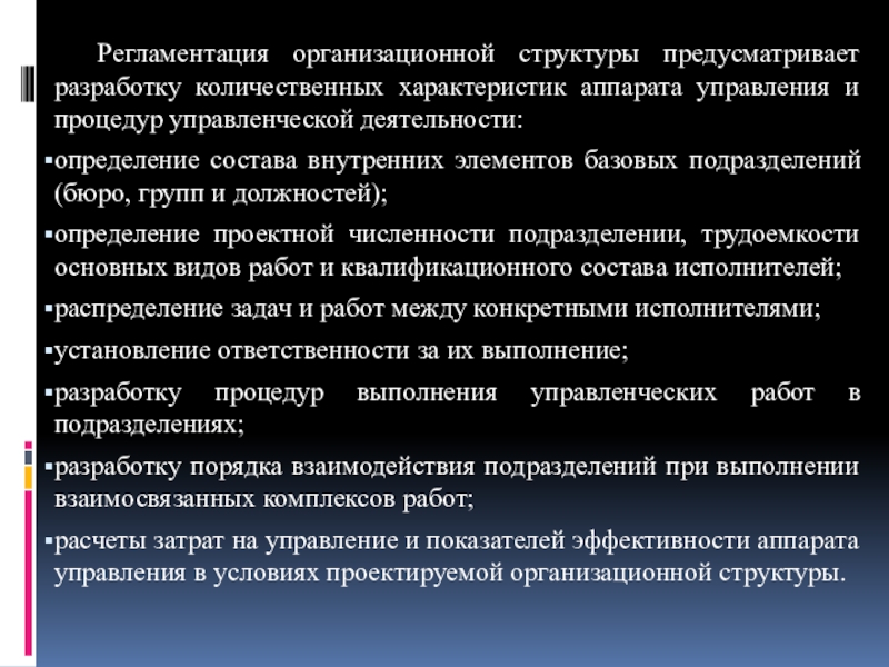 Слайд 23Регламентация организационной структуры предусматривает разработку количественных характеристик аппарата управления и процедур