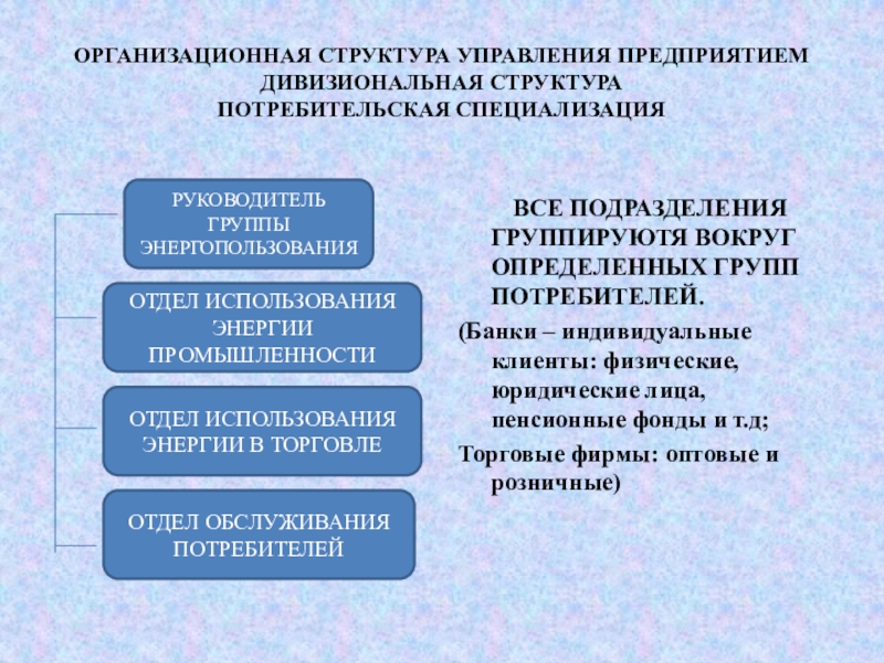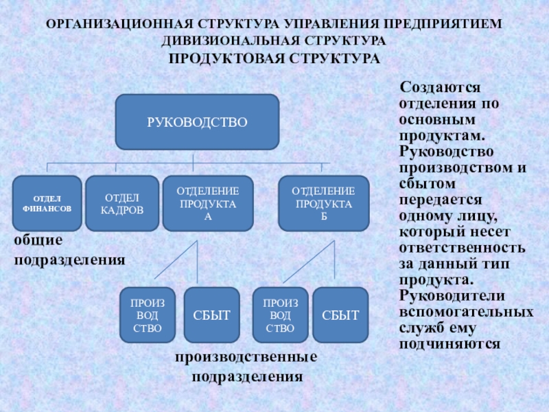 Создаются отделения по основным продуктам. Руководство производством и сбытом передается одному лицу, который несет ответственность за данный тип продукта. Руководители вспомогательных служб ему подчиняются