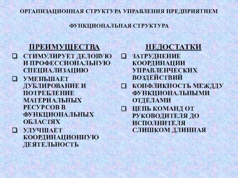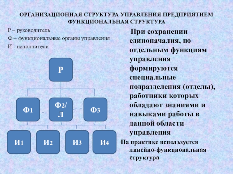 При сохранении единоначалия, по отдельным функциям управления формируются специальные подразделения (отделы), работники которых обладают знаниями и навыками работы в данной области управления