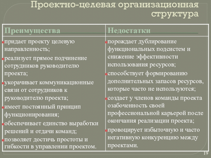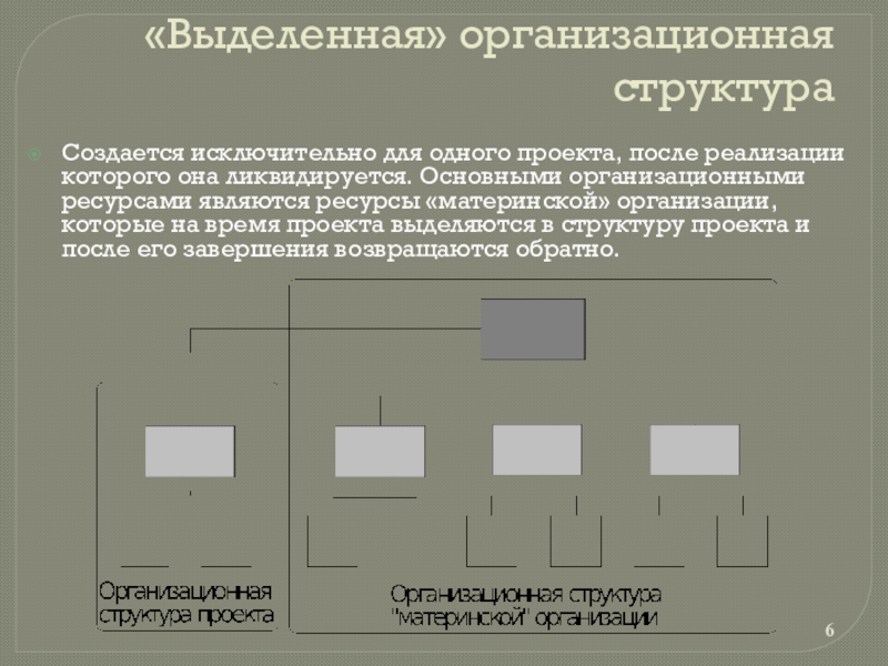 она ликвидируется. Основными организационными ресурсами являются ресурсы «материнской» организации, которые на время проекта выделяются в структуру проекта и после его завершения возвращаются обратно.