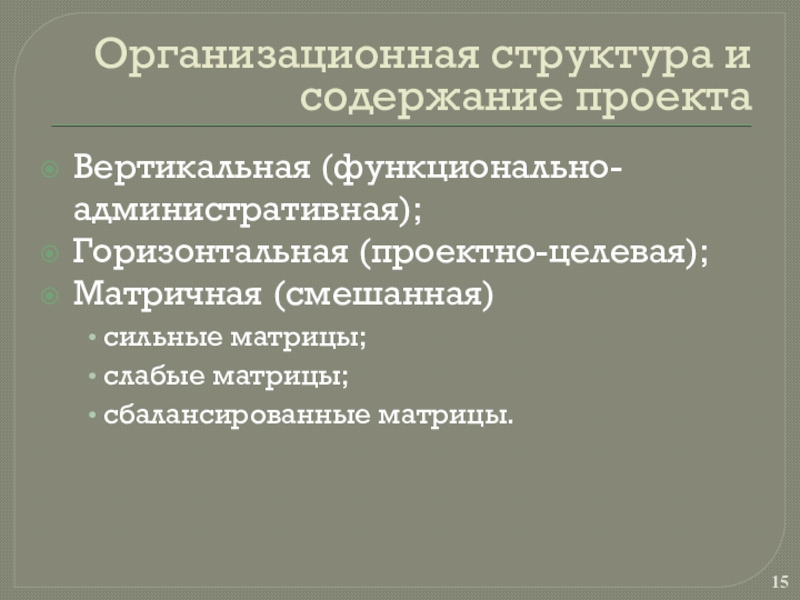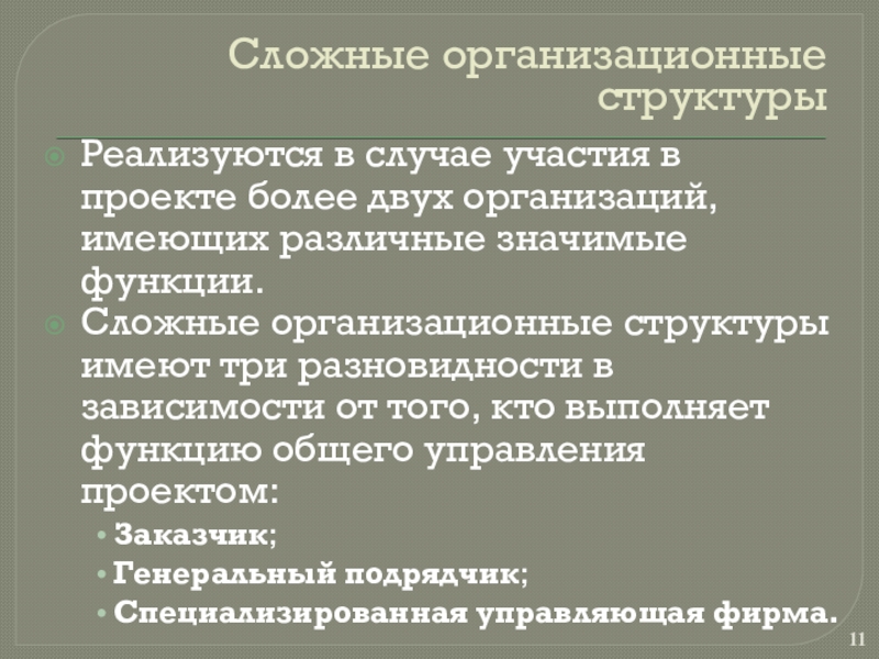 Сложные организационные структуры имеют три разновидности в зависимости от того, кто выполняет функцию общего управления проектом: