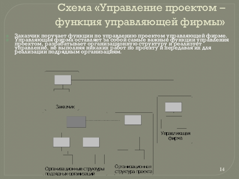 Слайд 14Схема «Управление проектом – функция управляющей фирмы»