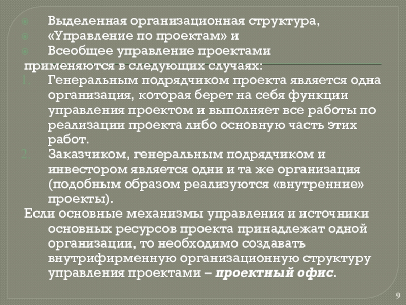 Если основные механизмы управления и источники основных ресурсов проекта принадлежат одной организации, то необходимо создавать внутрифирменную организационную структуру управления проектами – проектный офис.
