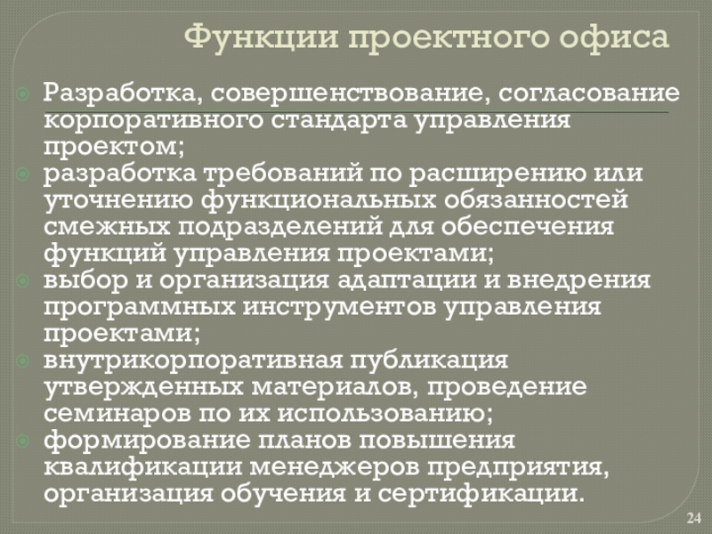 Разработка, совершенствование, согласование корпоративного стандарта управления проектом;