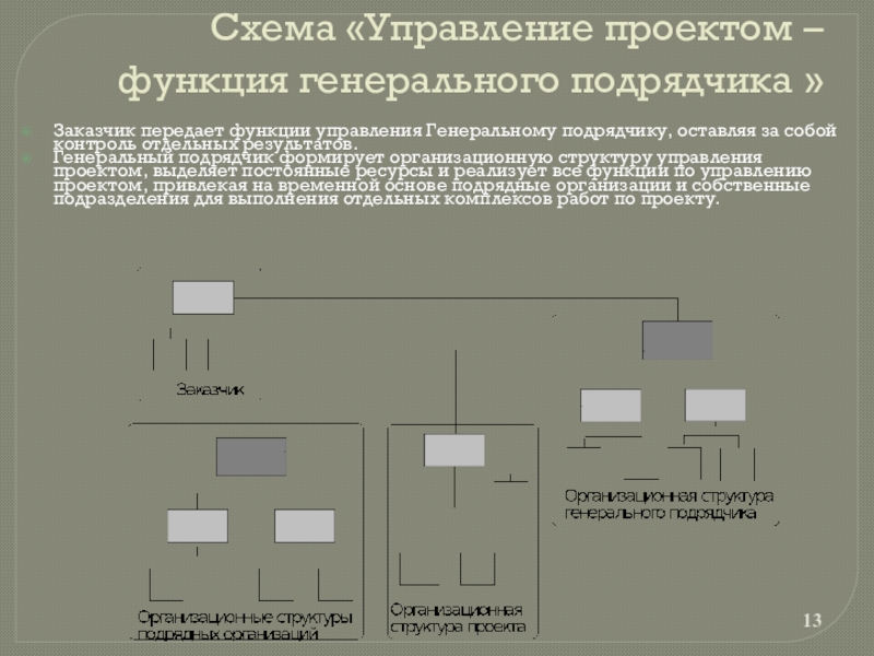 Слайд 13Схема «Управление проектом – функция генерального подрядчика »