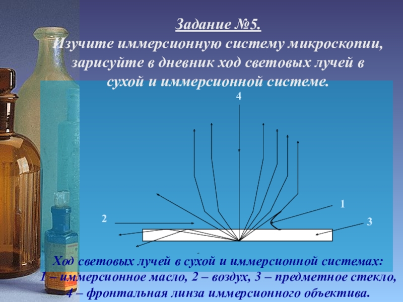 1 – иммерсионное масло, 2 – воздух, 3 – предметное стекло, 4 – фронтальная линза иммерсионного объектива.