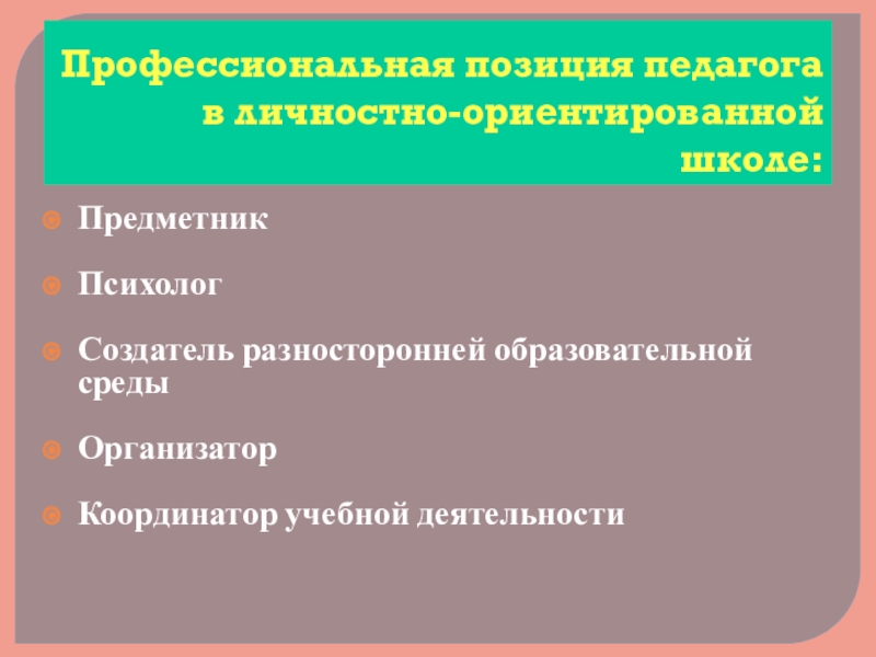 Слайд 5Профессиональная позиция педагога в личностно-ориентированной школе: