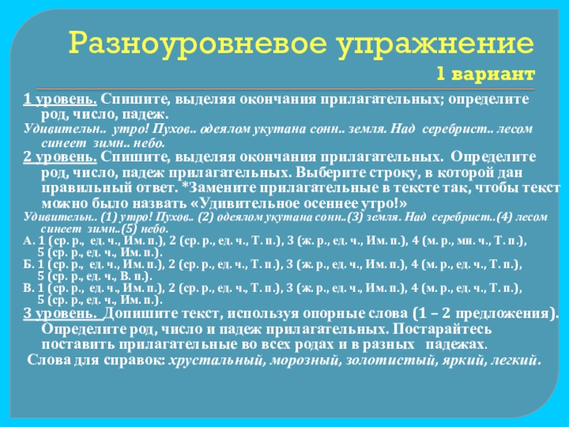 2 уровень. Спишите, выделяя окончания прилагательных. Определите род, число, падеж прилагательных. Выберите строку, в которой дан правильный ответ. *Замените прилагательные в тексте так, чтобы текст можно было назвать «Удивительное осеннее утро!»
