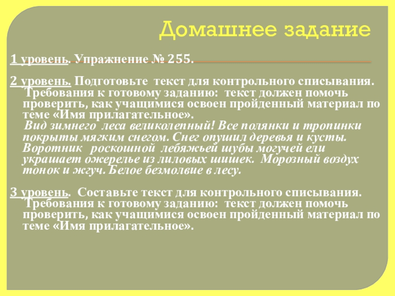 Требования к готовому заданию: текст должен помочь проверить, как учащимися освоен пройденный материал по теме «Имя прилагательное».