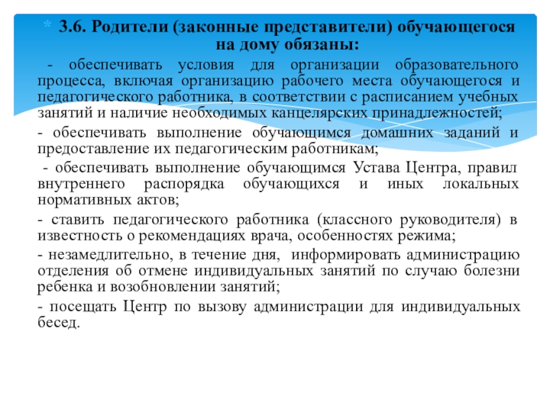 Слайд 233.6. Родители (законные представители) обучающегося на дому обязаны: