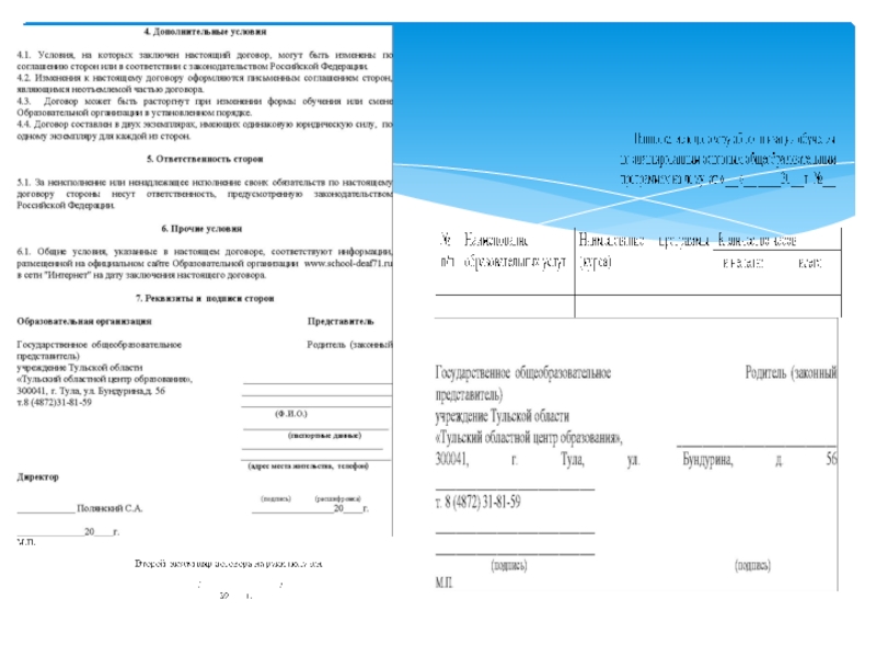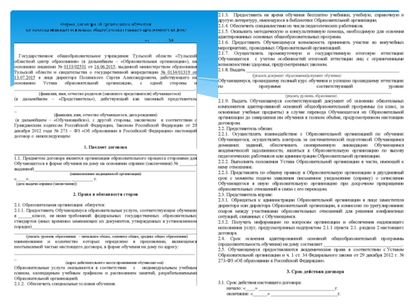 - заключает с родителями (законными представителями) обучающихся договор об организации обучения на дому в соответствии с постановлением правительства Тульской области от 05.11.2014 № 554 (приложение 3);