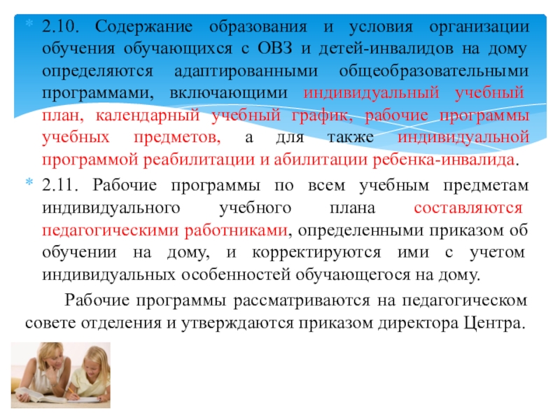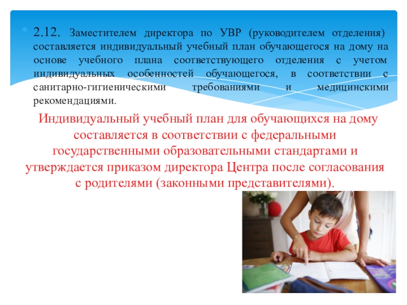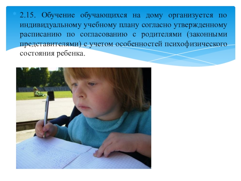 Слайд 162.15. Обучение обучающихся на дому организуется по индивидуальному учебному плану согласно