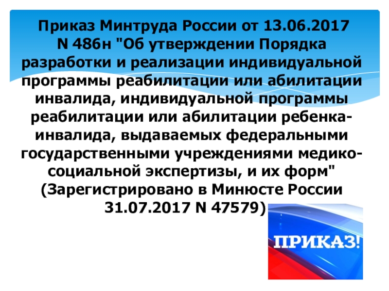 разработки и реализации индивидуальной программы реабилитации или абилитации инвалида, индивидуальной программы реабилитации или абилитации ребенка-инвалида, выдаваемых федеральными государственными учреждениями медико-социальной экспертизы, и их форм" (Зарегистрировано в Минюсте России 31.07.2017 N 47579)