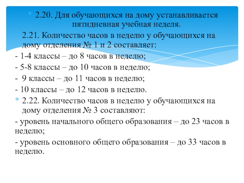 Слайд 182.20. Для обучающихся на дому устанавливается пятидневная учебная неделя.