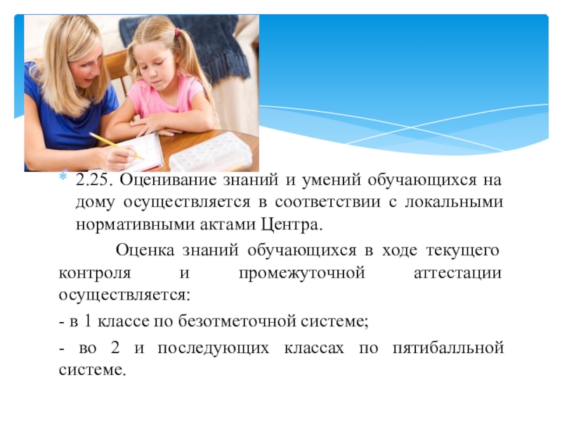 Слайд 202.25. Оценивание знаний и умений обучающихся на дому осуществляется в соответствии