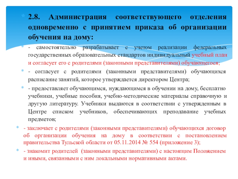 Слайд 102.8. Администрация соответствующего отделения одновременно с принятием приказа об организации обучения