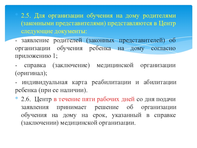 2.6. Центр в течение пяти рабочих дней со дня подачи заявления принимает решение об организации обучения на дому на срок, указанный в справке (заключении) медицинской организации.