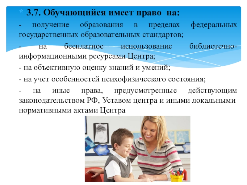 Слайд 243.7. Обучающийся имеет право на: