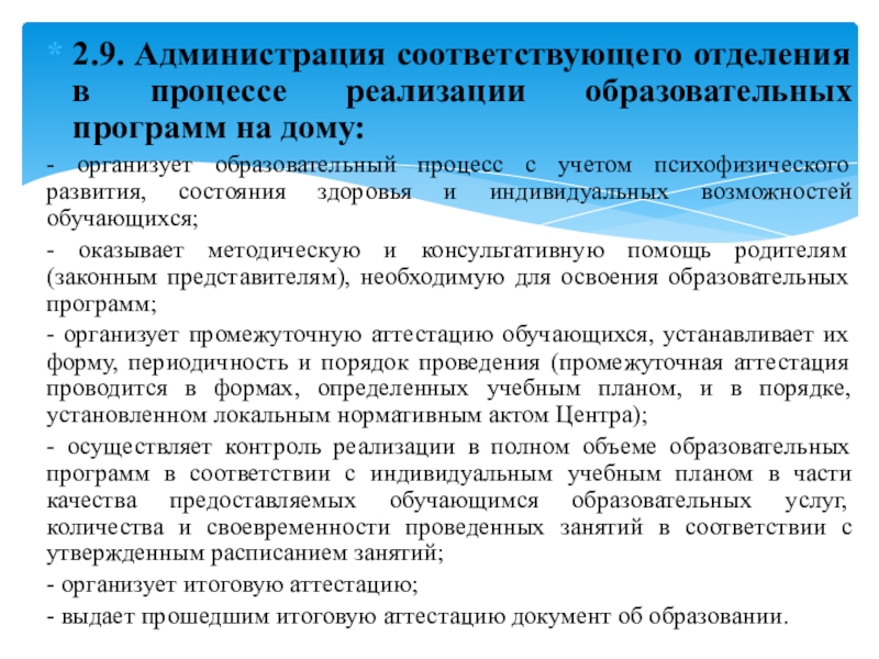 Слайд 112.9. Администрация соответствующего отделения в процессе реализации образовательных программ на дому: