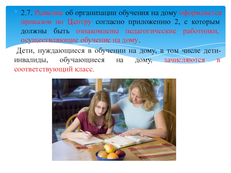 Слайд 92.7. Решение об организации обучения на дому оформляется приказом по Центру