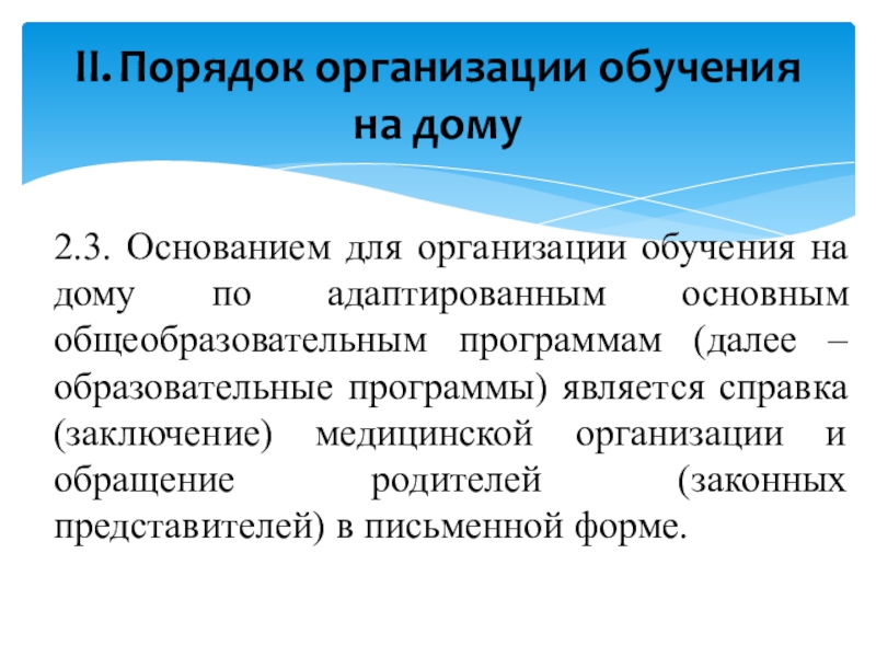 Слайд 7II. Порядок организации обучения на дому