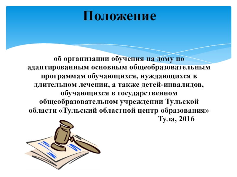 программам обучающихся, нуждающихся в длительном лечении, а также детей-инвалидов, обучающихся в государственном общеобразовательном учреждении Тульской области «Тульский областной центр образования», (далее – Положение, Центр) устанавливает правила организации обучения на дому обучающихся, нуждающихся в длительном