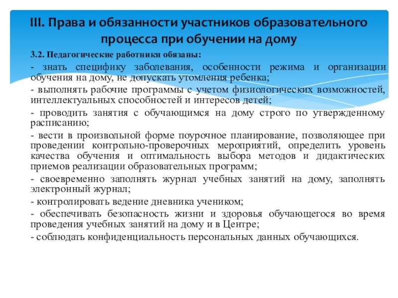 III. Права и обязанности участников образовательного процесса при обучении на дому