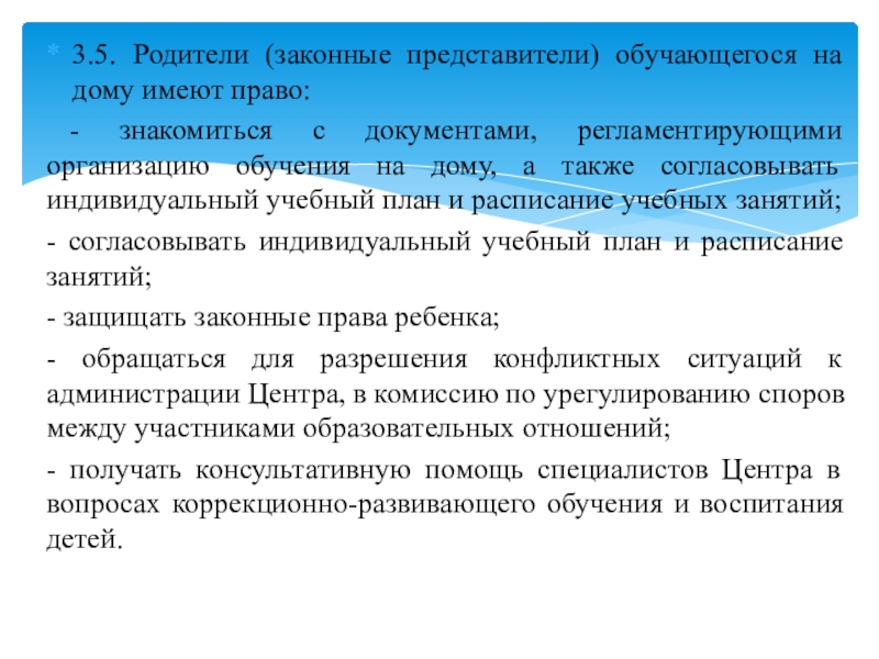 Слайд 223.5. Родители (законные представители) обучающегося на дому имеют право: