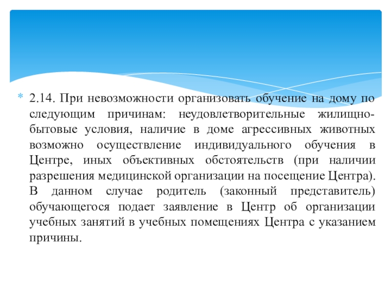Слайд 152.14. При невозможности организовать обучение на дому по следующим причинам: неудовлетворительные