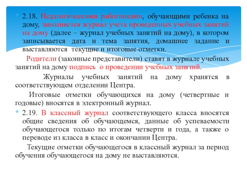 Слайд 172.18. Педагогическими работниками, обучающими ребенка на дому, заполняется журнал учета проведенных