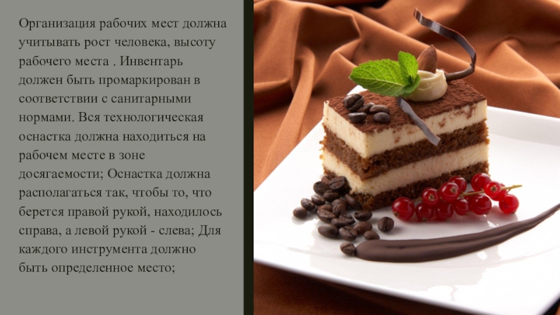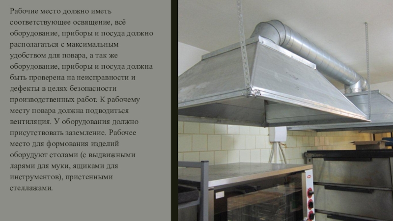 Слайд 27Рабочие место должно иметь соответствующее освящение, всё оборудование, приборы и посуда