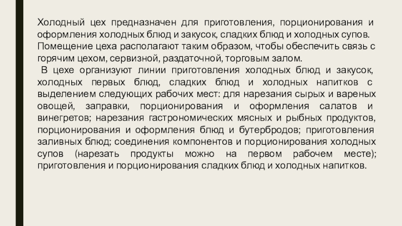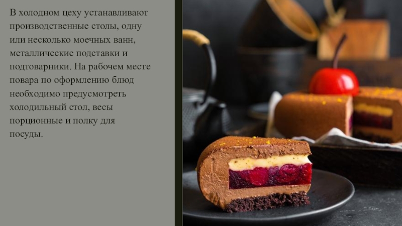 Слайд 5Холодный цех предназначен для приготовления, порционирования и оформления холодных блюд и