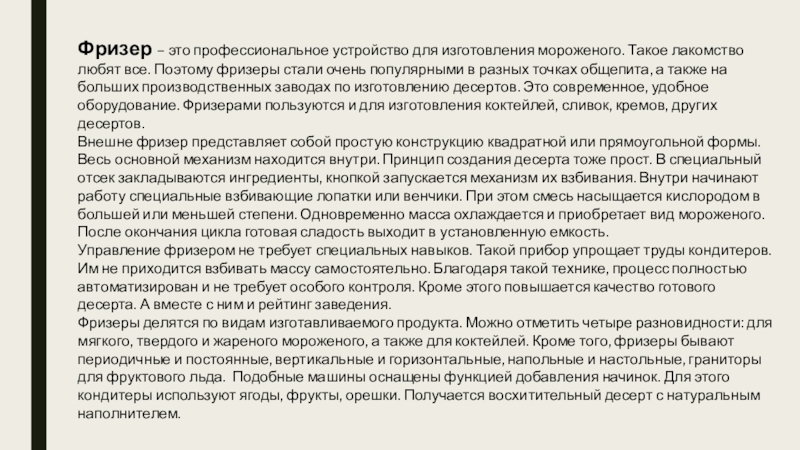 Слайд 19Фризер – это профессиональное устройство для изготовления мороженого. Такое лакомство любят