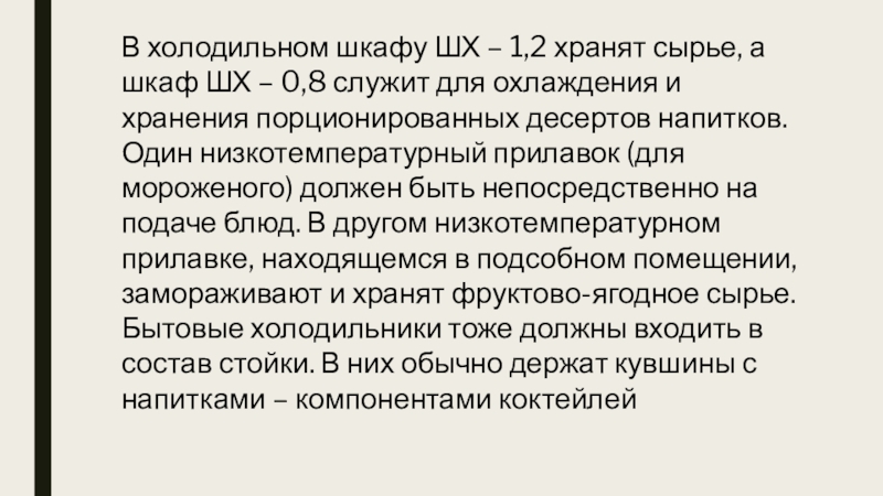 – 0,8 служит для охлаждения и хранения порционированных десертов напитков. Один низкотемпературный прилавок (для мороженого) должен быть непосредственно на подаче блюд. В другом низкотемпературном прилавке, находящемся в подсобном помещении, замораживают и хранят фруктово-ягодное сырье. Бытовые холодильники тоже должны входить в состав стойки. В них обычно держат кувшины с напитками – компонентами коктейлей