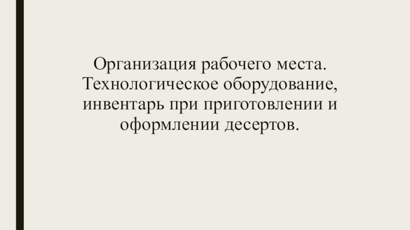 Слайд 8Организация рабочего места. Технологическое оборудование, инвентарь при приготовлении и оформлении десертов.