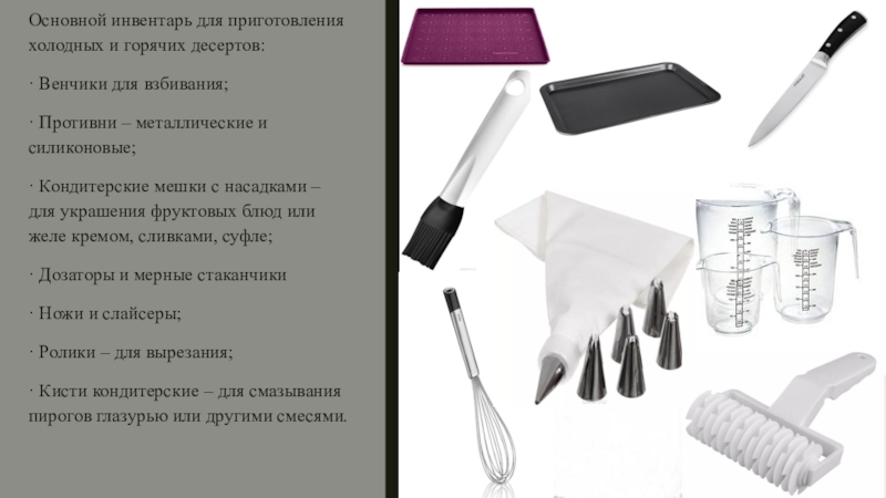 Слайд 30Основной инвентарь для приготовления холодных и горячих десертов: